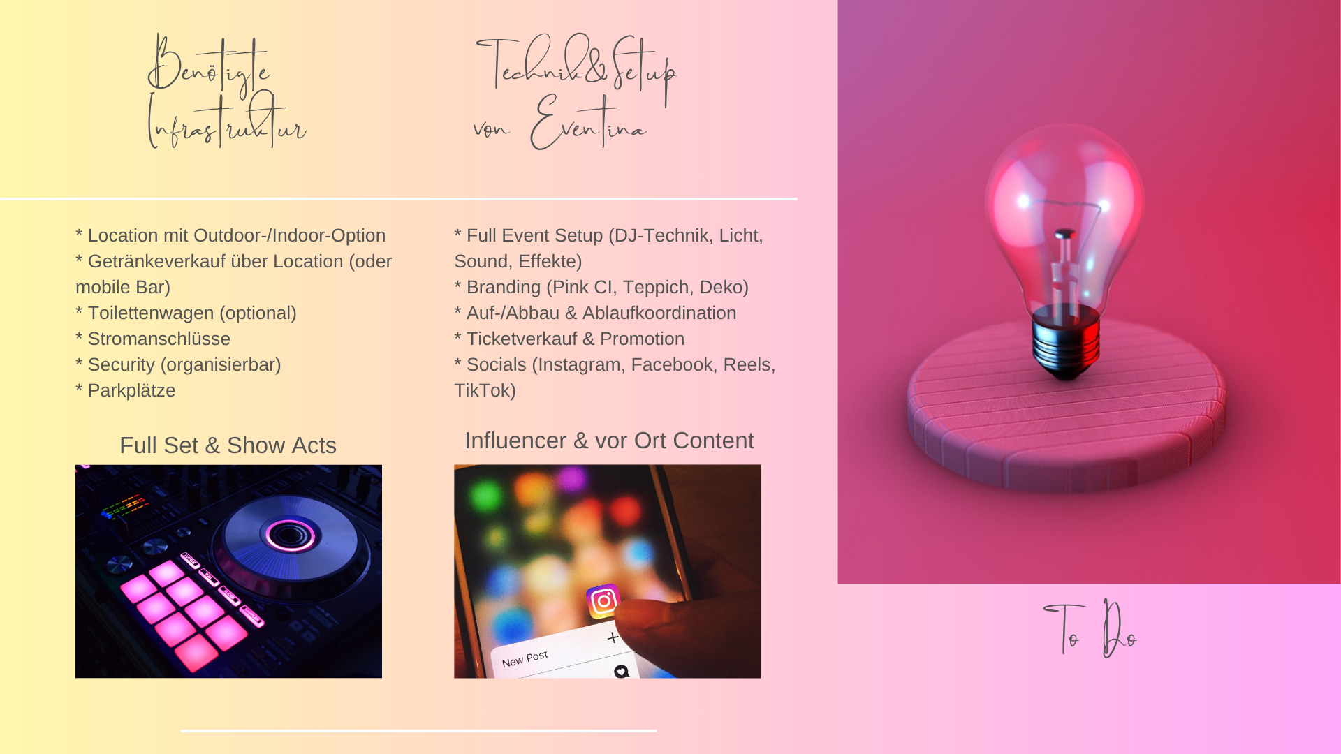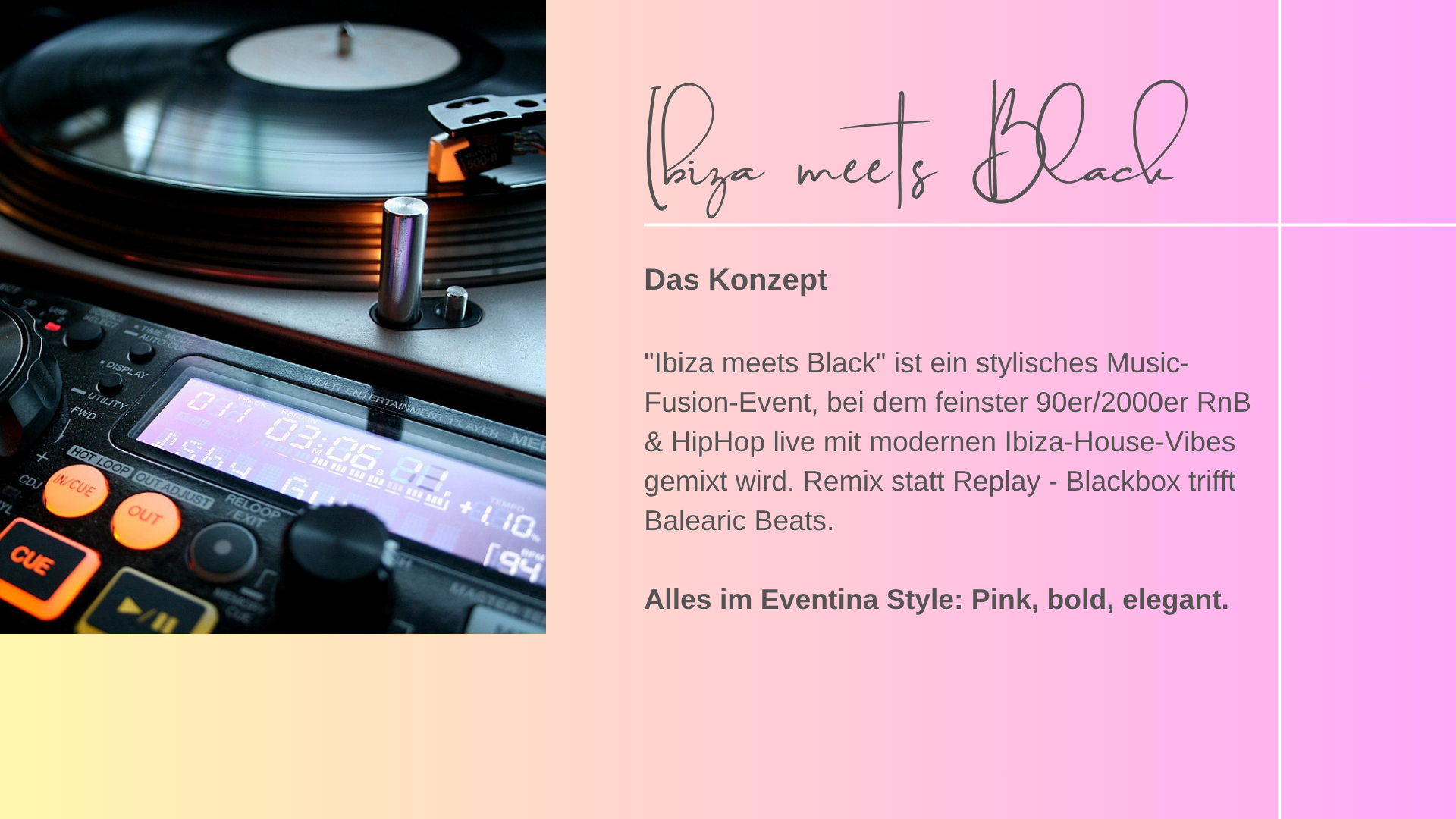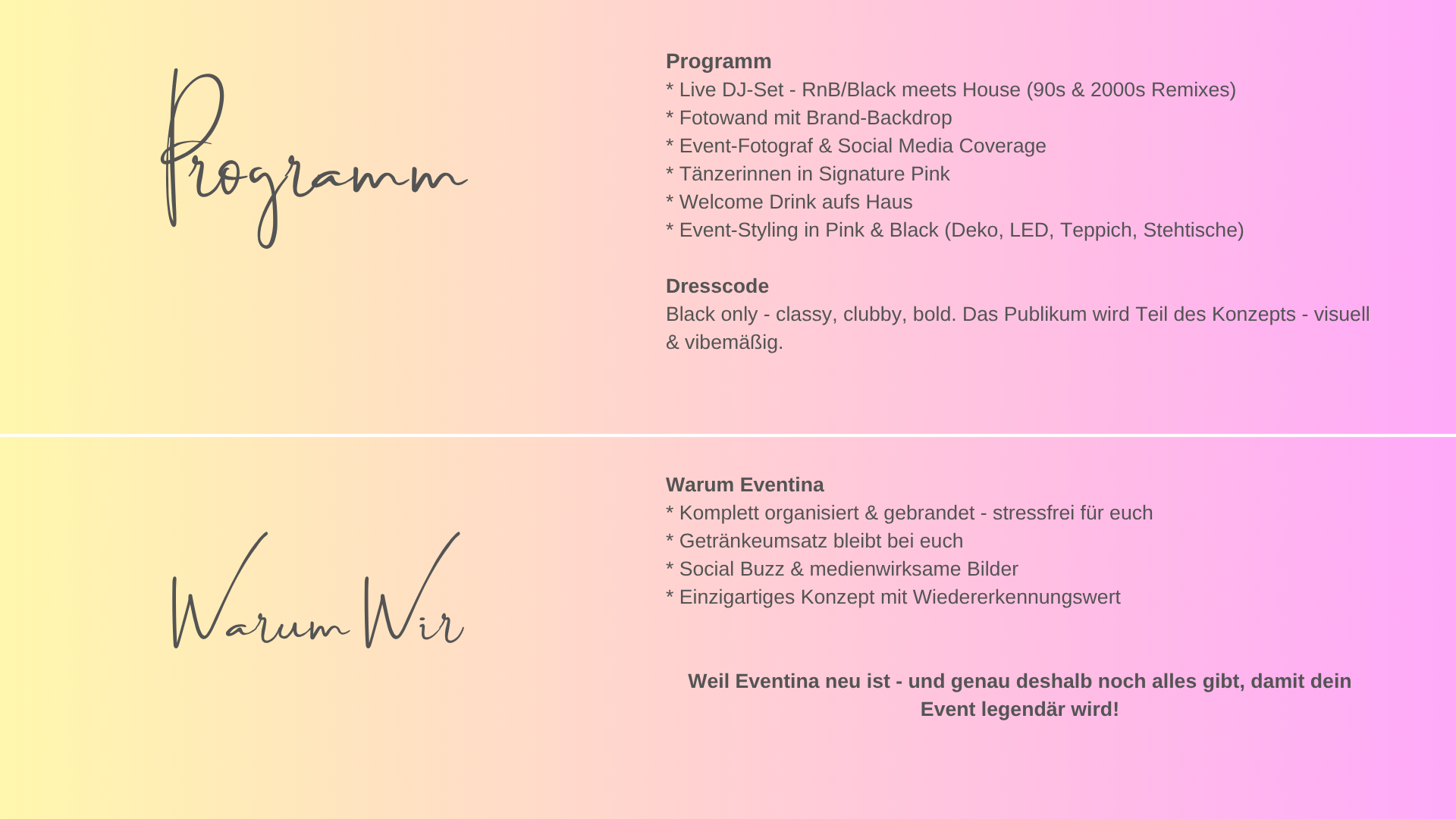 Mit Eventina bekommst du Konzepte, die anders sind – frech, kreativ, und mit dem Mut, Grenzen zu sprengen.
